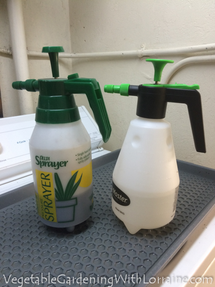 My two hand-pump sprayers, one with water and one with liquid kelp fertilizer. |