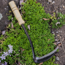 Weeds are much easier to deal with when they are very little. My favorite tool for this job is a little Japanese weeding sickle called a nejiri kama that you pull toward you about a quarter inch underneath the soil surface to cleanly cut off the weeds at the root. But if you catch weeds when they're little enough, any sort of scuffling up the surface of the soil will knock the little weeds down.